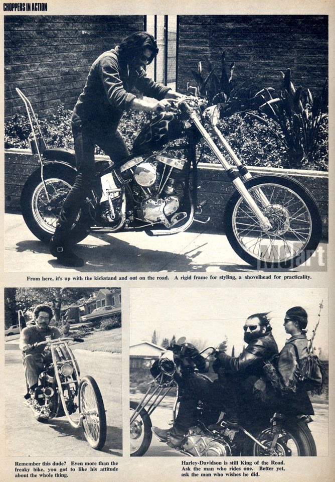 The shovel at the top is just about perfect. Forks are little long for today but right in style then. The bottom left photo was used on the cover of the Nov. '69 Choppers Magazine. Bottom right, I don't recognize the bike, but it kind of looks like Dick Allen. He did once run a girder and a chrome frame.