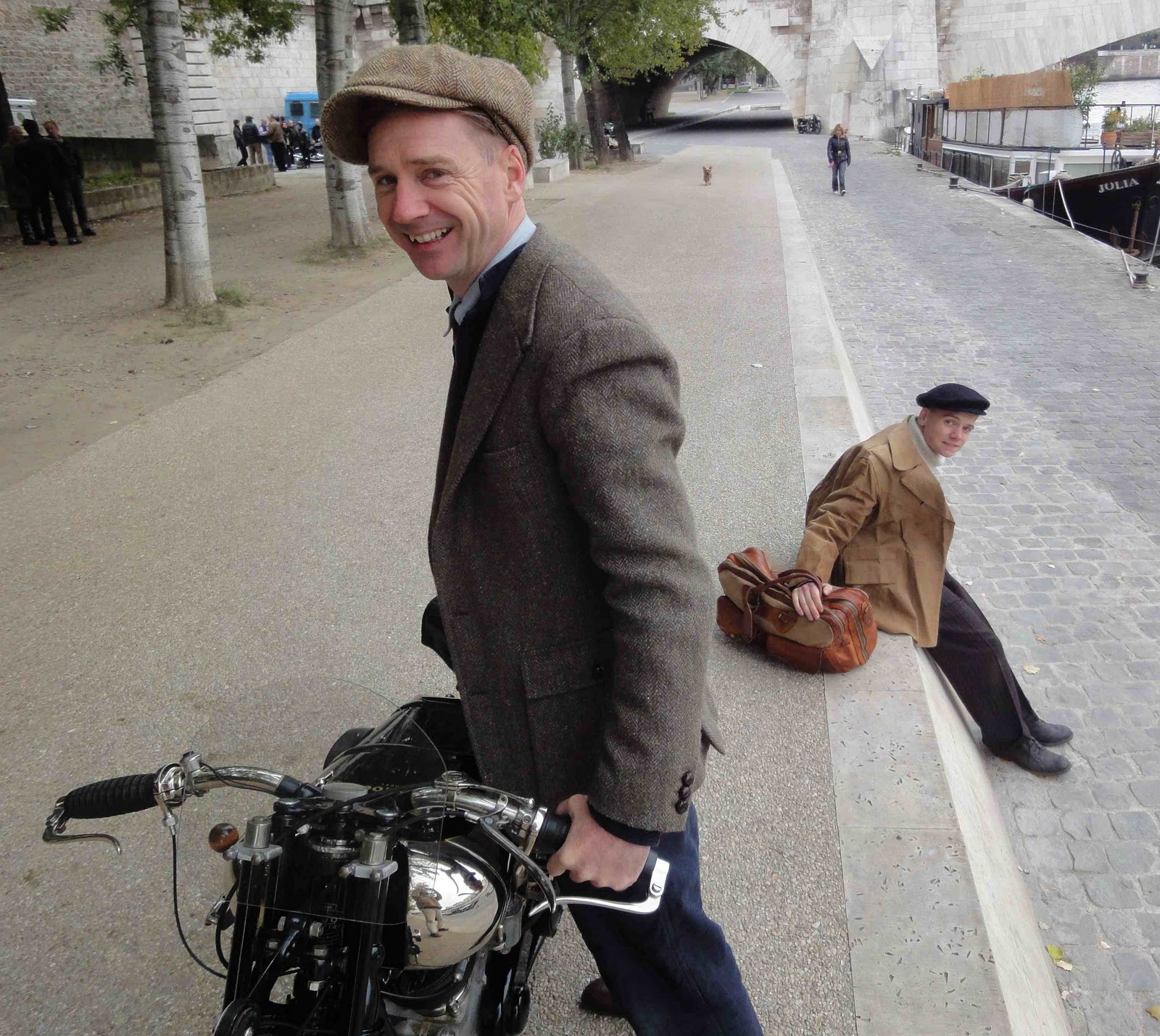 It seemed an excellent opportunity: the confluence of the Men's File crew, a sunny day in Paris, and a million dollars' worth of Brough Superiors. Nick Clements had brought two models (Spirit of Britain's Simon Delaney and friend) along for atmosphere at the Ralph Lauren/Men's File party the night prior, so we had gents in period dress, motorcycles, and a picturesque spot on the Seine, on the quai under Pont Sully, relatively free of perambulators and bicyclists, and nearly devoid of modern vehicles, having in one direction only the river, the 1800s buildings of Paris, and a series of river barges which a few hardy souls call home.